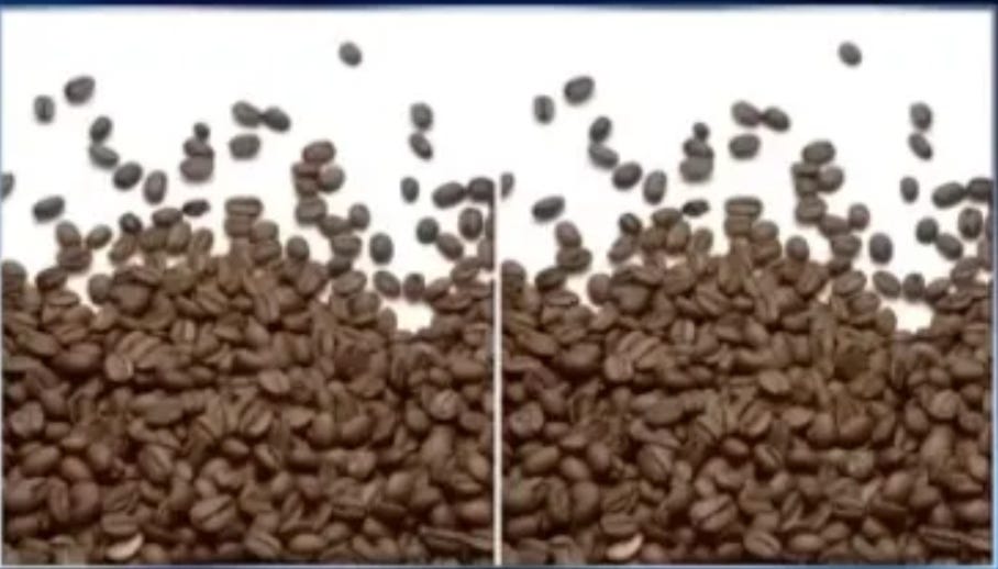 In the example below, she was presented with two images of hundreds of coffee beans spread out on a table. To my eye, both images looked exactly the same. But it took her only a couple of seconds to call out that one coffee bean was missing on the left side of the image: