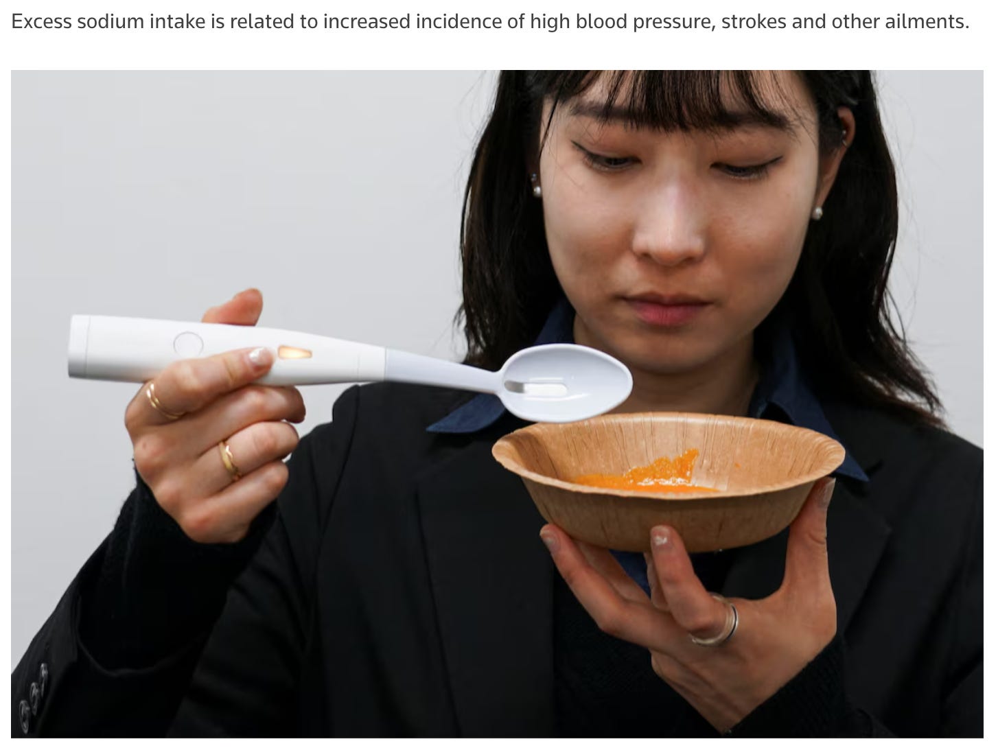 A Japanese company, Kirin, just introduced an electric spoon at CES 2025 that enhances the taste of low-sodium food through mild electrical stimulation, making it taste saltier without adding salt. The device, priced at $127, aims to help reduce sodium consumption, targeting the Japanese market where sodium intake is double the recommended daily amount.